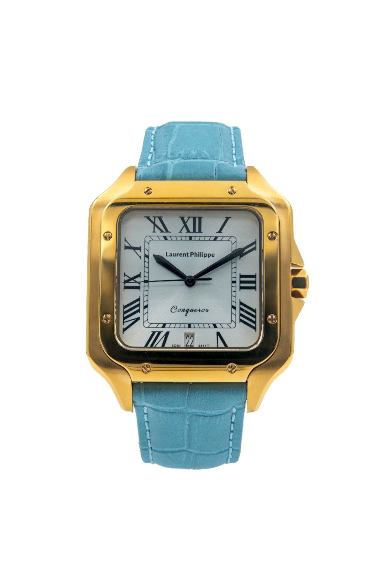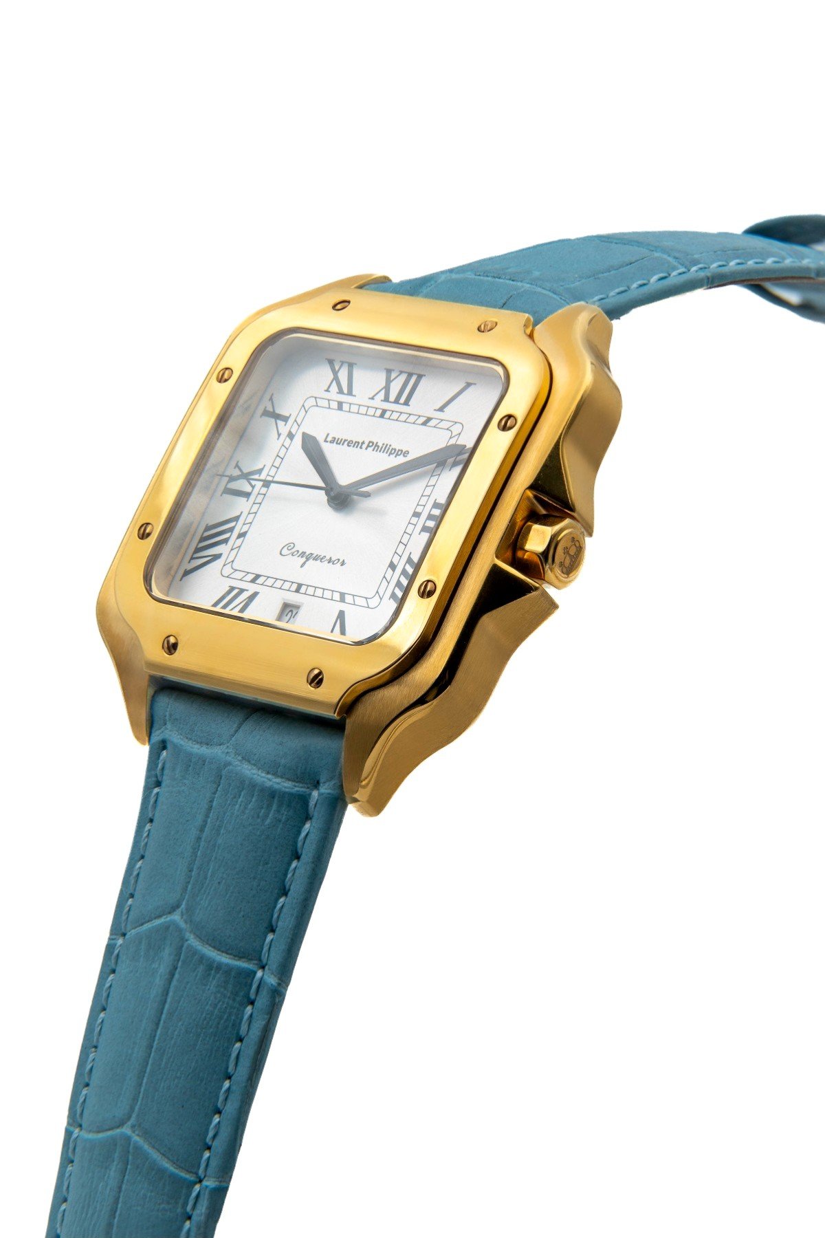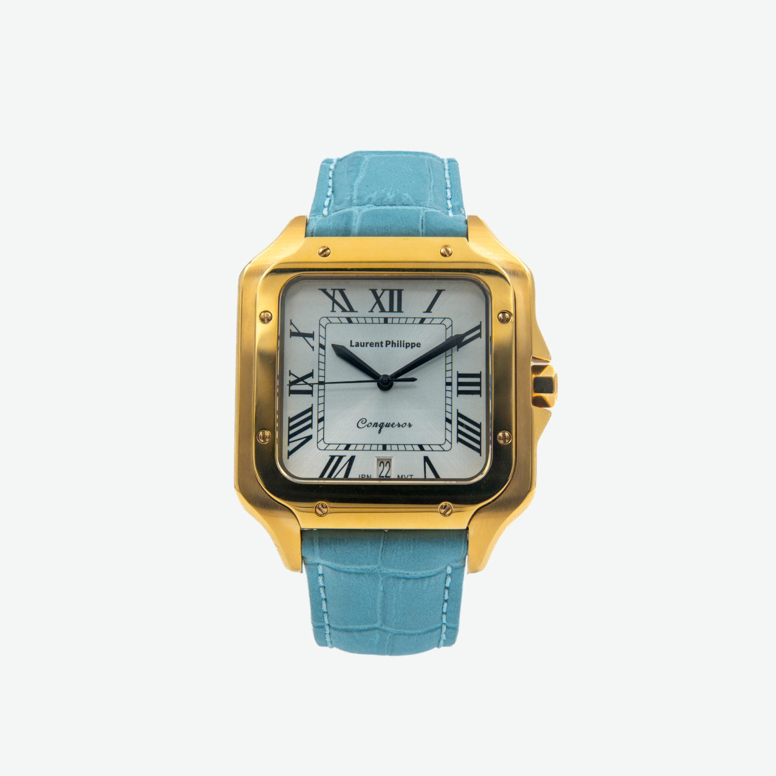 Gold-tone watch with glossy white dial and pale turquoise cow leather strap — fresh, poised, and elegantly unexpected.