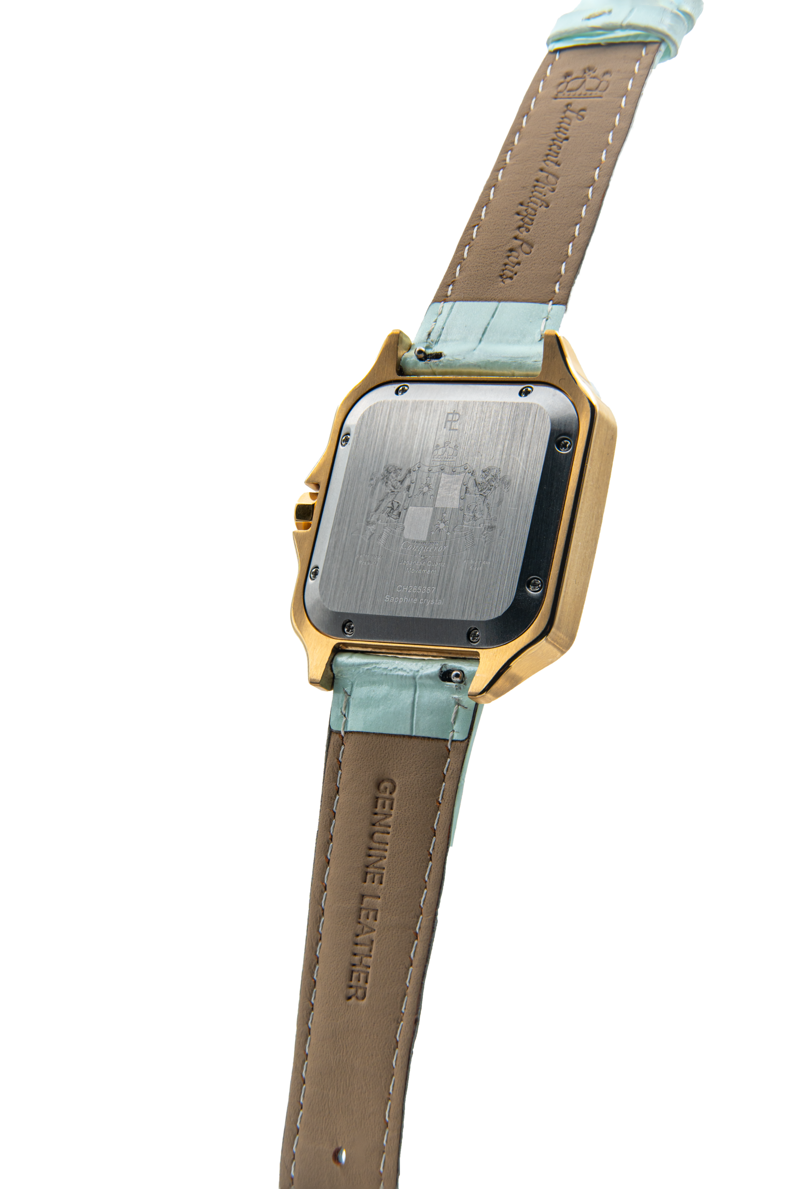 Gold-tone watch with glossy white dial and mint green cow leather strap — clean, seductive, and composed with rare subtlety.