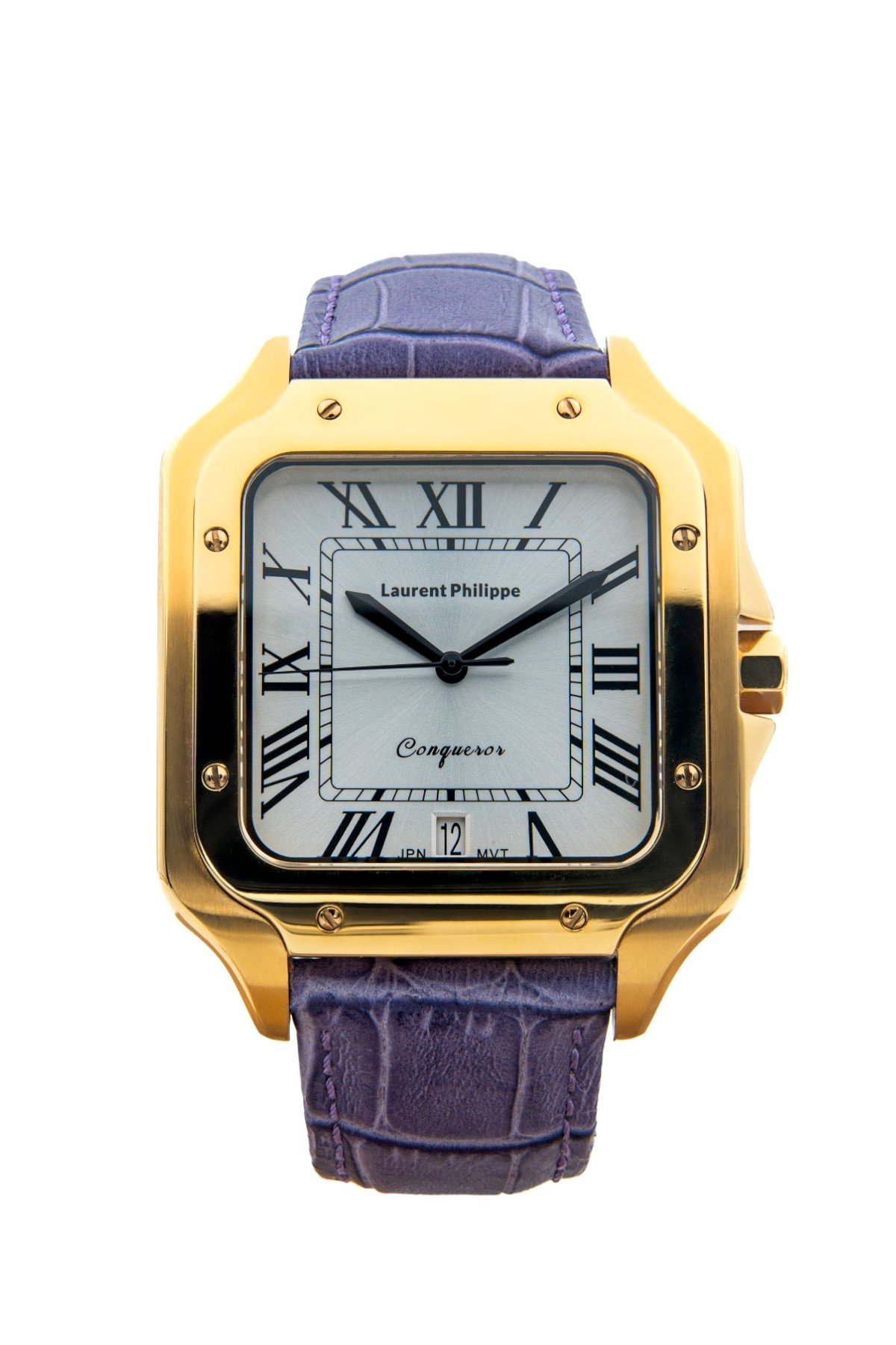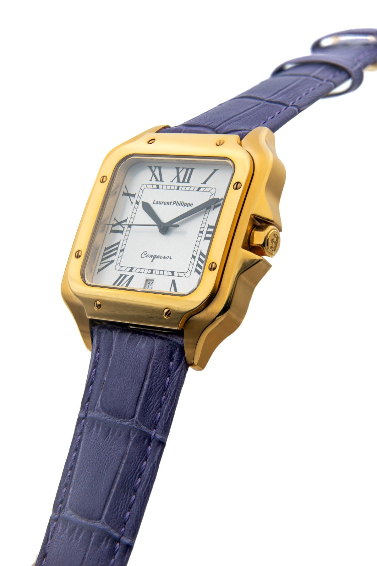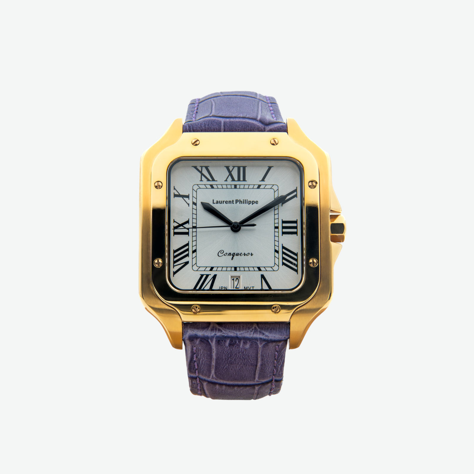 Gold-tone watch with glossy white dial and violet cow leather strap — intense, structured, and cold with refined seduction.