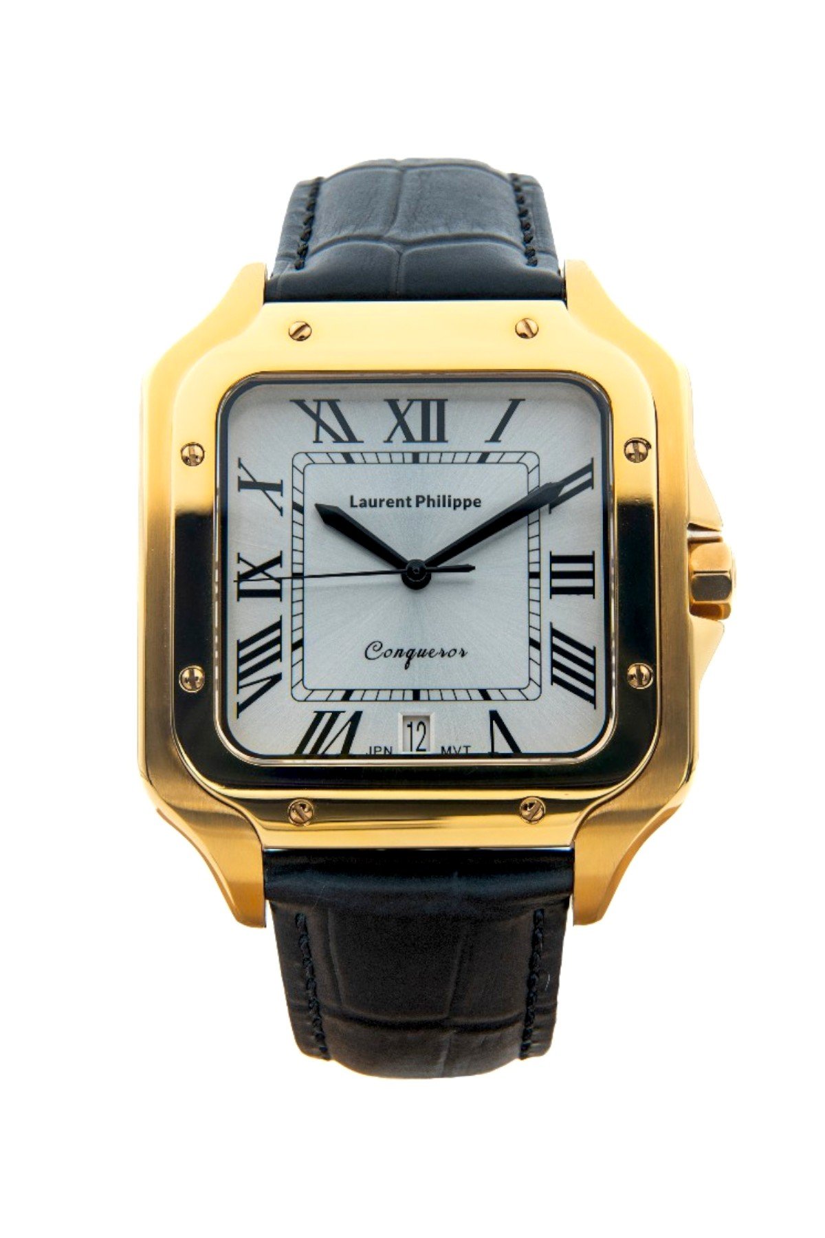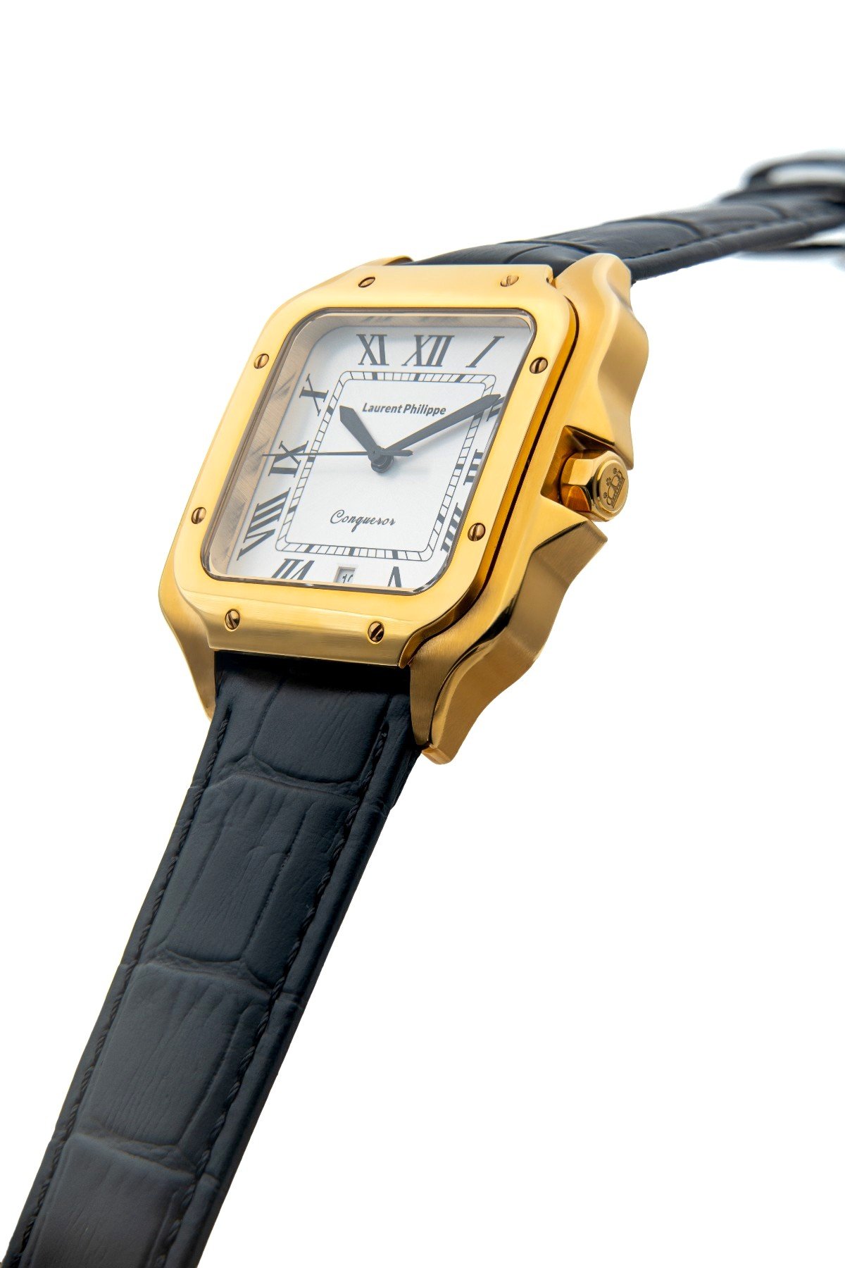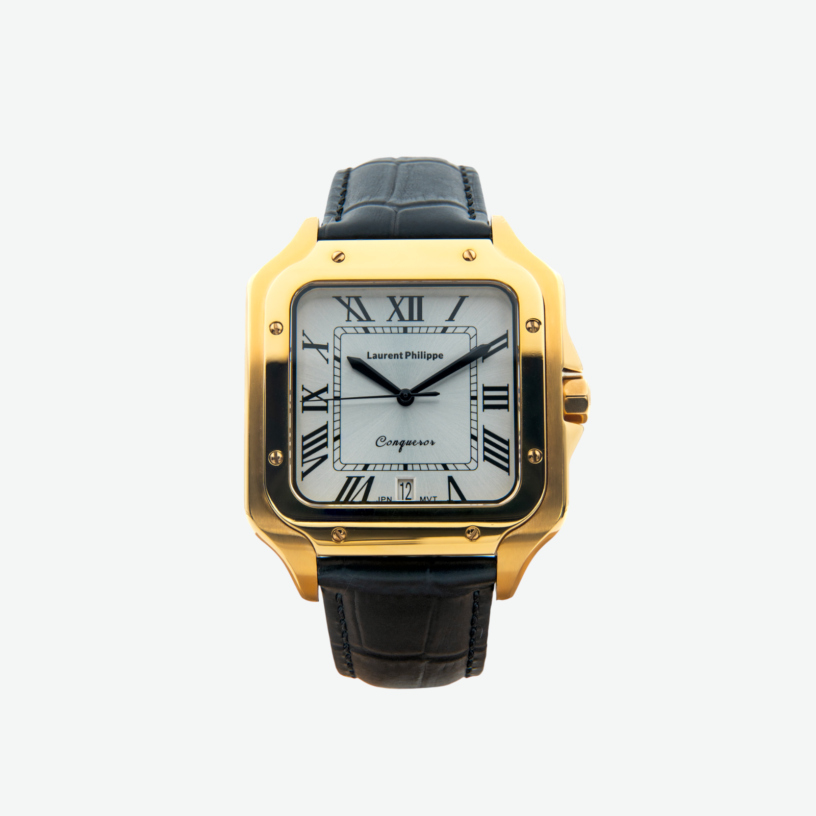 Gold-tone watch with glossy white dial and full black cow leather strap — cold, precise, and unmistakably commanding.