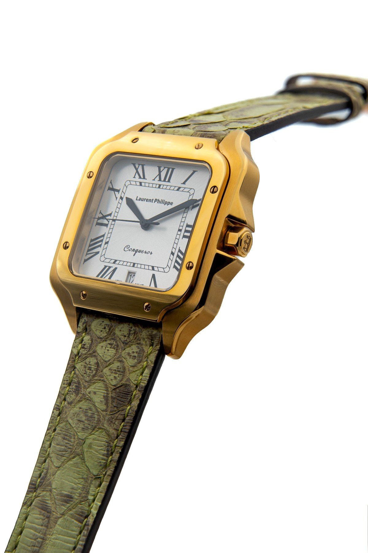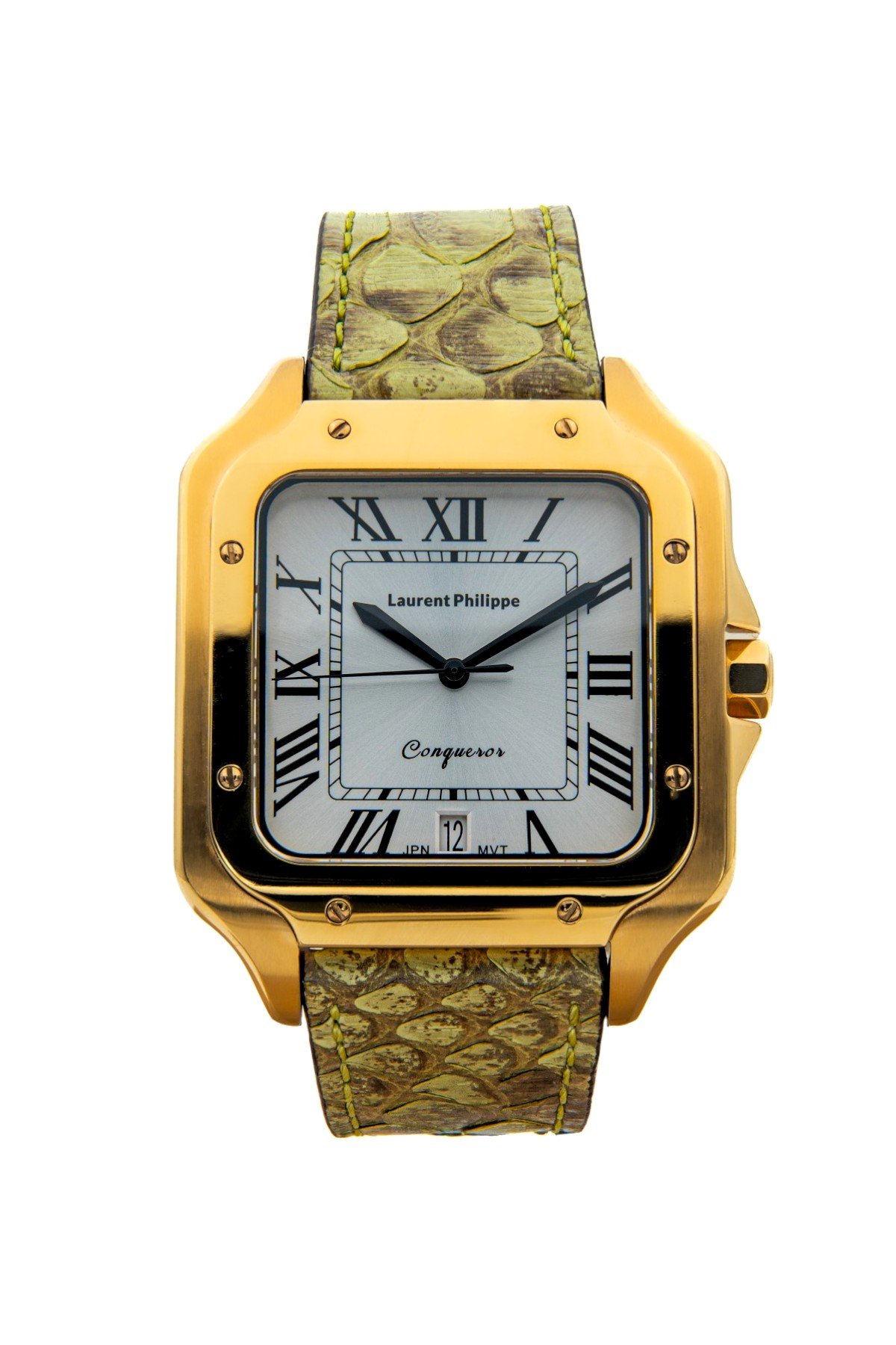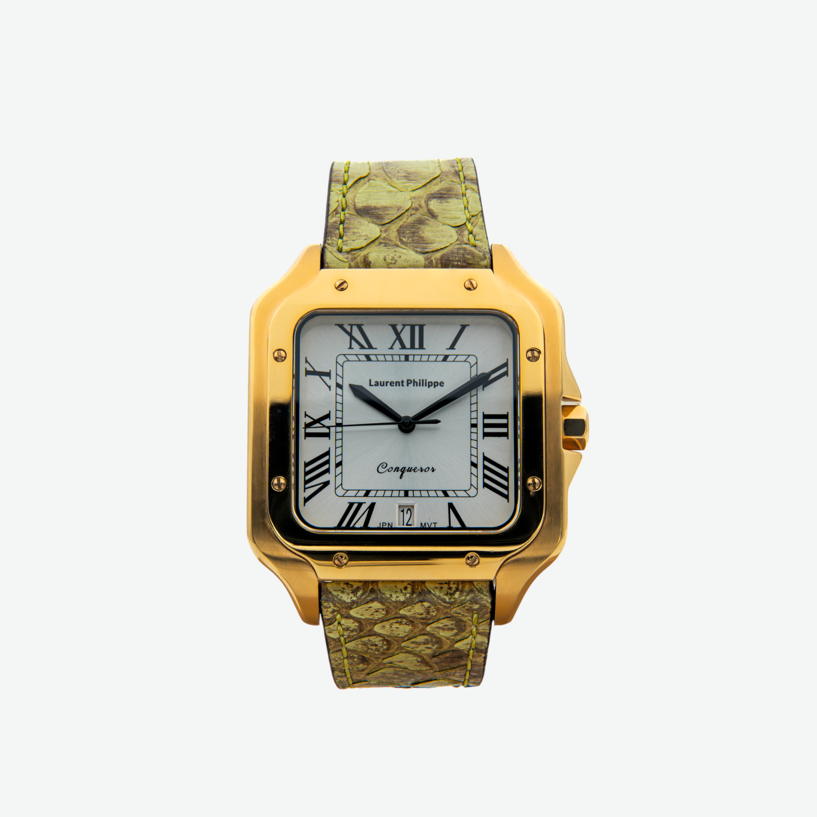 Gold-tone watch with glossy white dial and yellow-green python leather strap — striking, textured, and dangerously exotic.