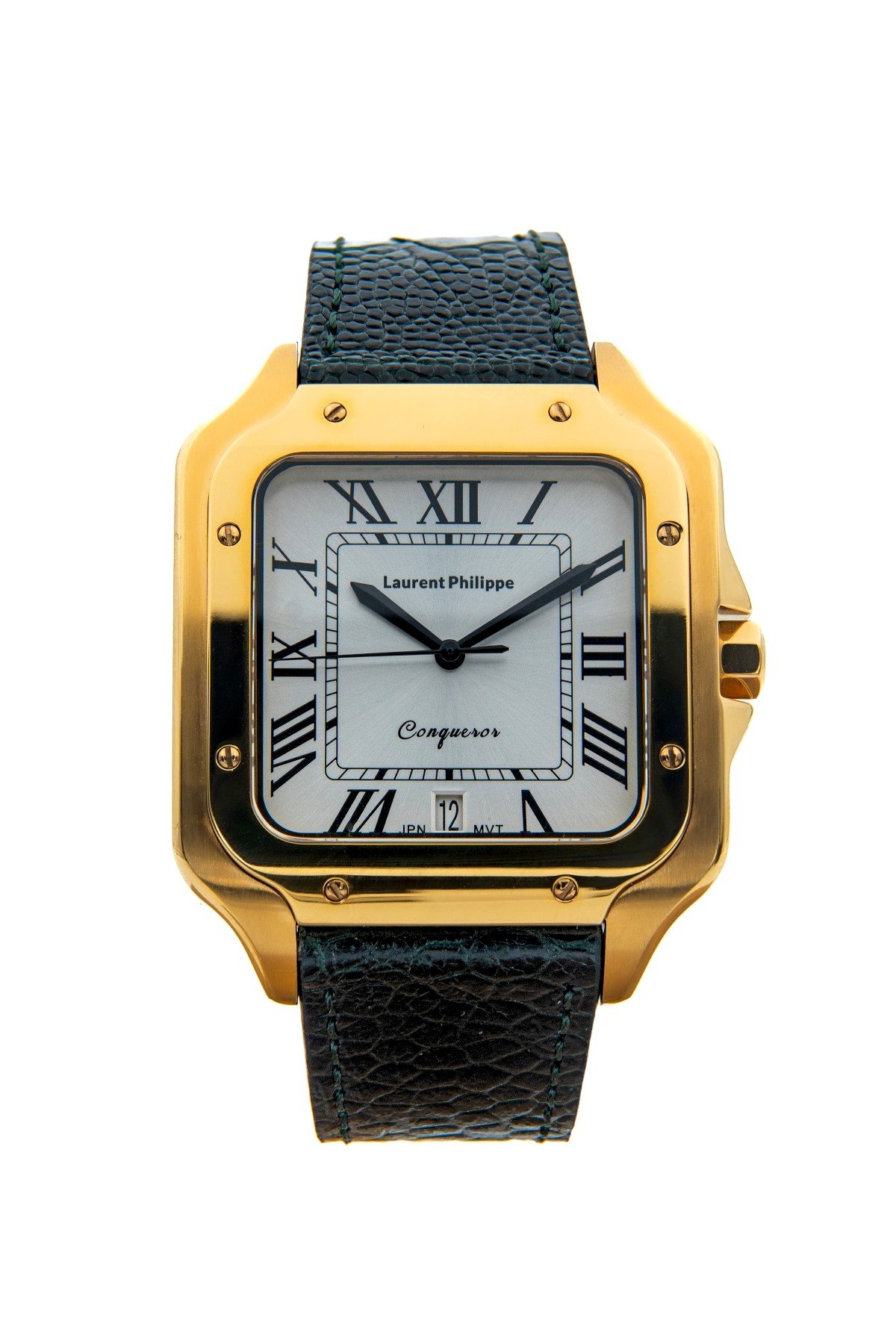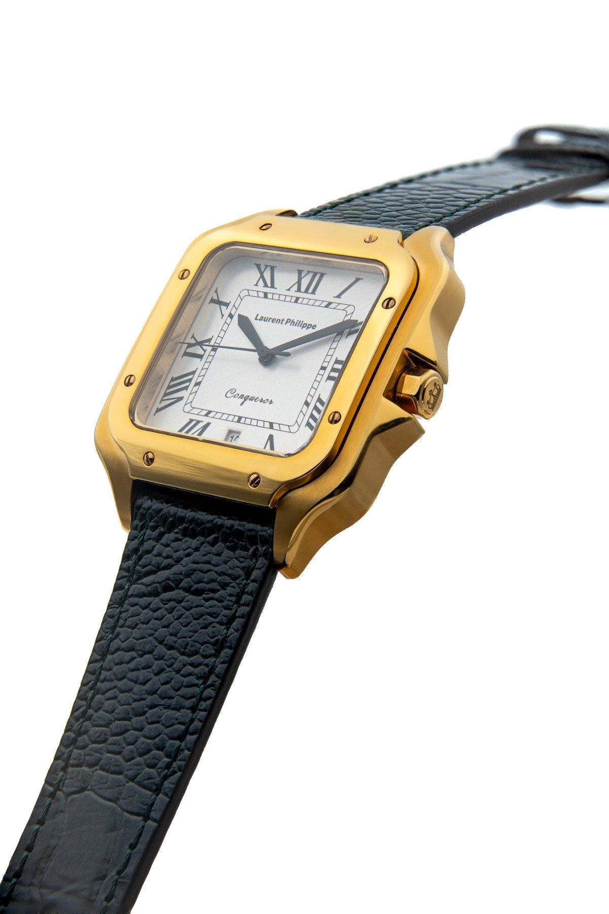 Gold-tone watch with glossy white dial and dark green ostrich leather strap — decadent, sculptural, and born from rare desire.
