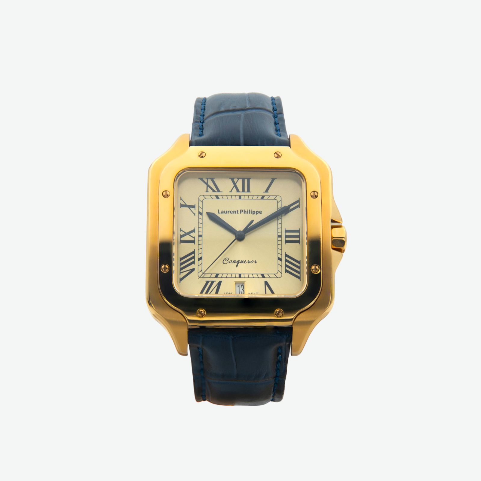 Gold-tone watch with black dial and electric blue snakeskin strap — rare, magnetic, and dangerously sexy.