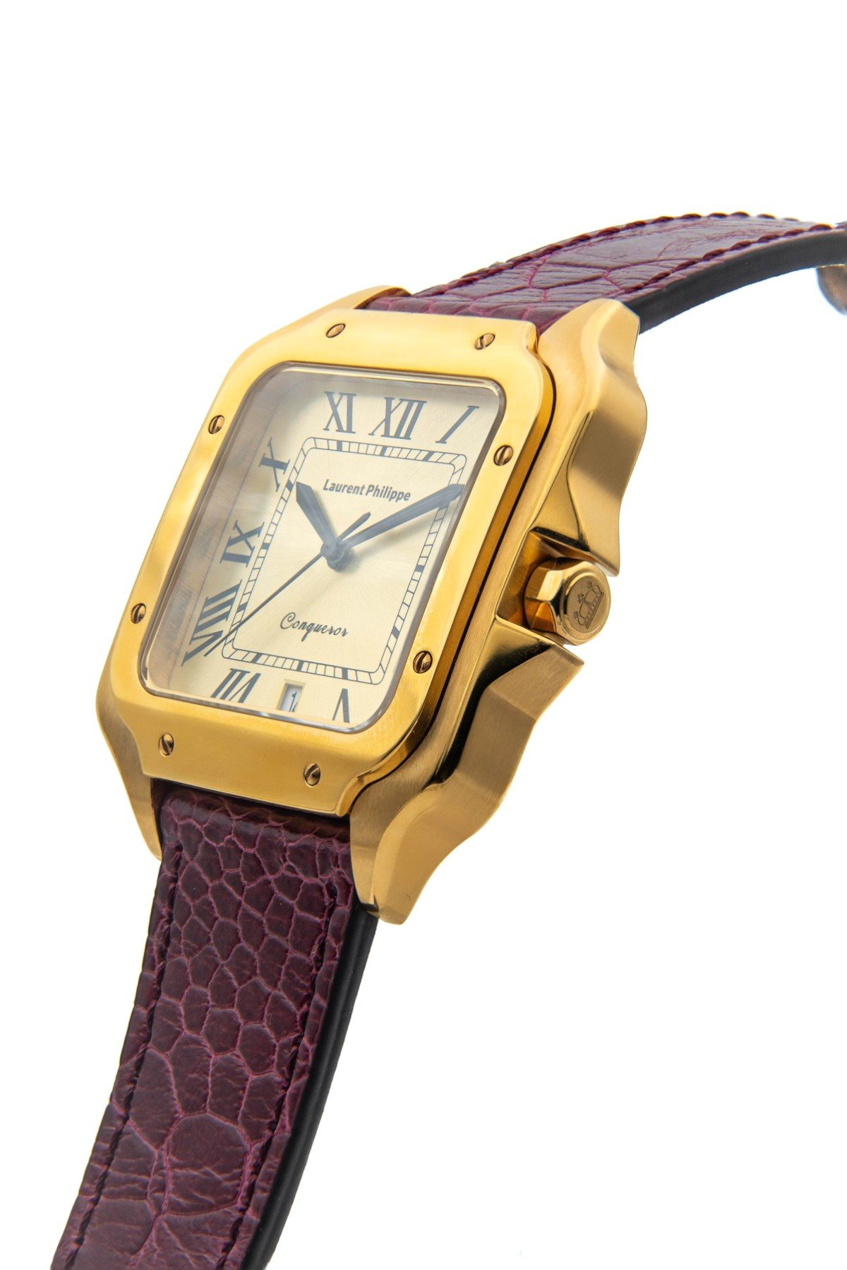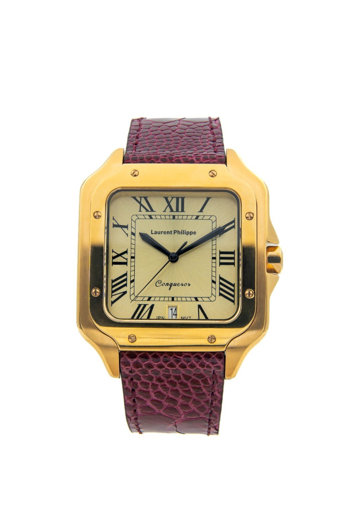Gold-tone watch with golden dial and violet-red ostrich leather strap — intense, sculptural, and emotionally rare.