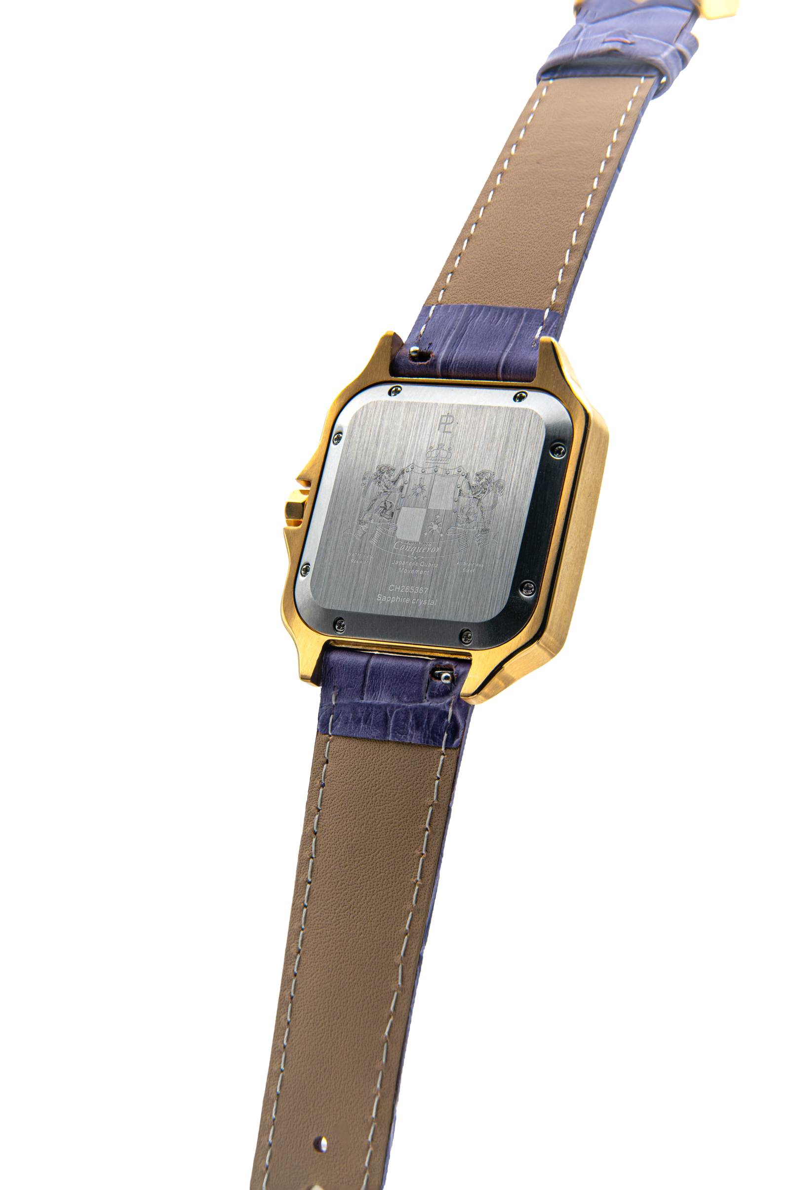 Gold-tone watch with golden dial and glossy violet cow leather strap — intense, extravagant, and strikingly magnetic.