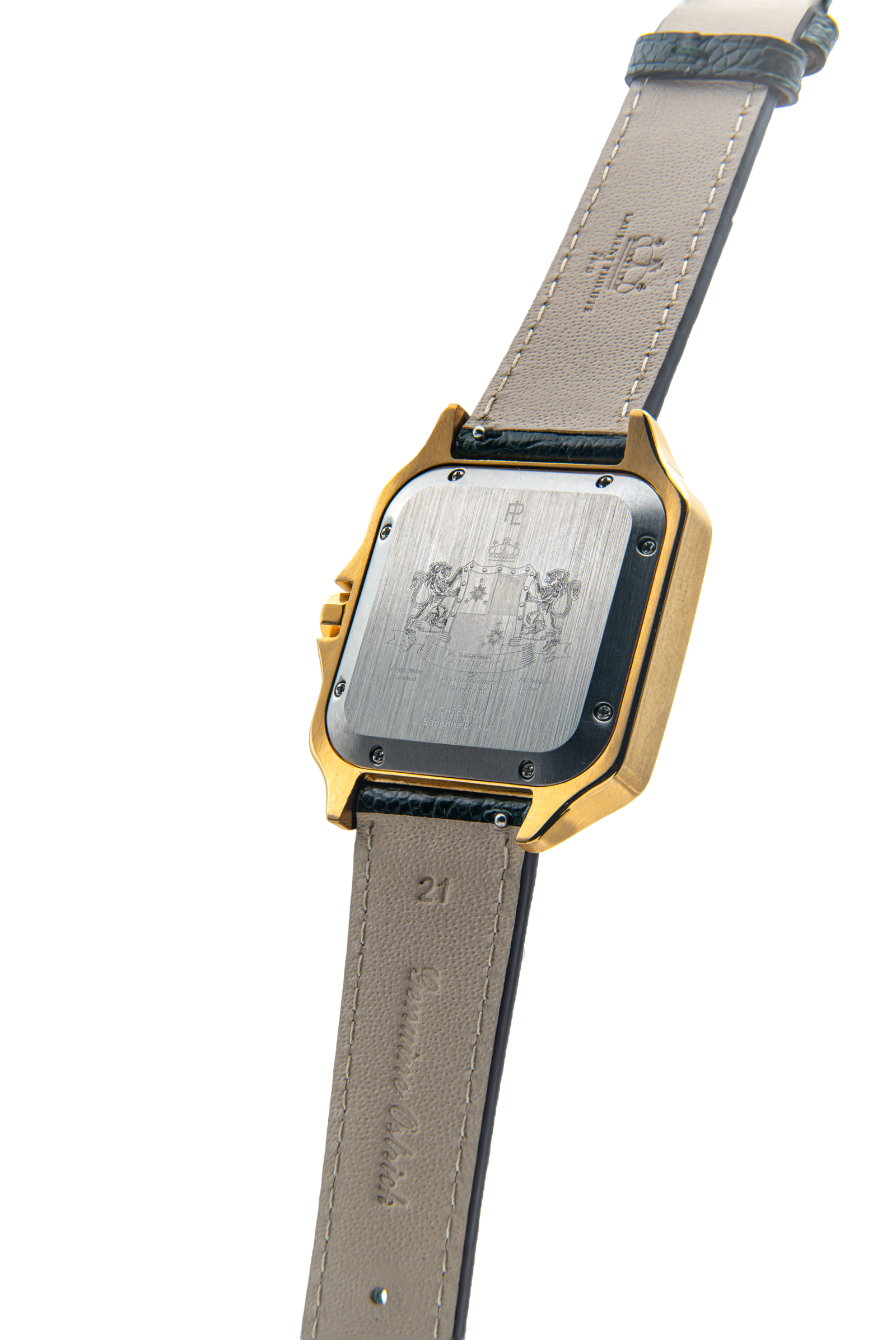Gold-tone watch with golden dial and dark green ostrich leather strap — enigmatic, refined, and visually commanding.