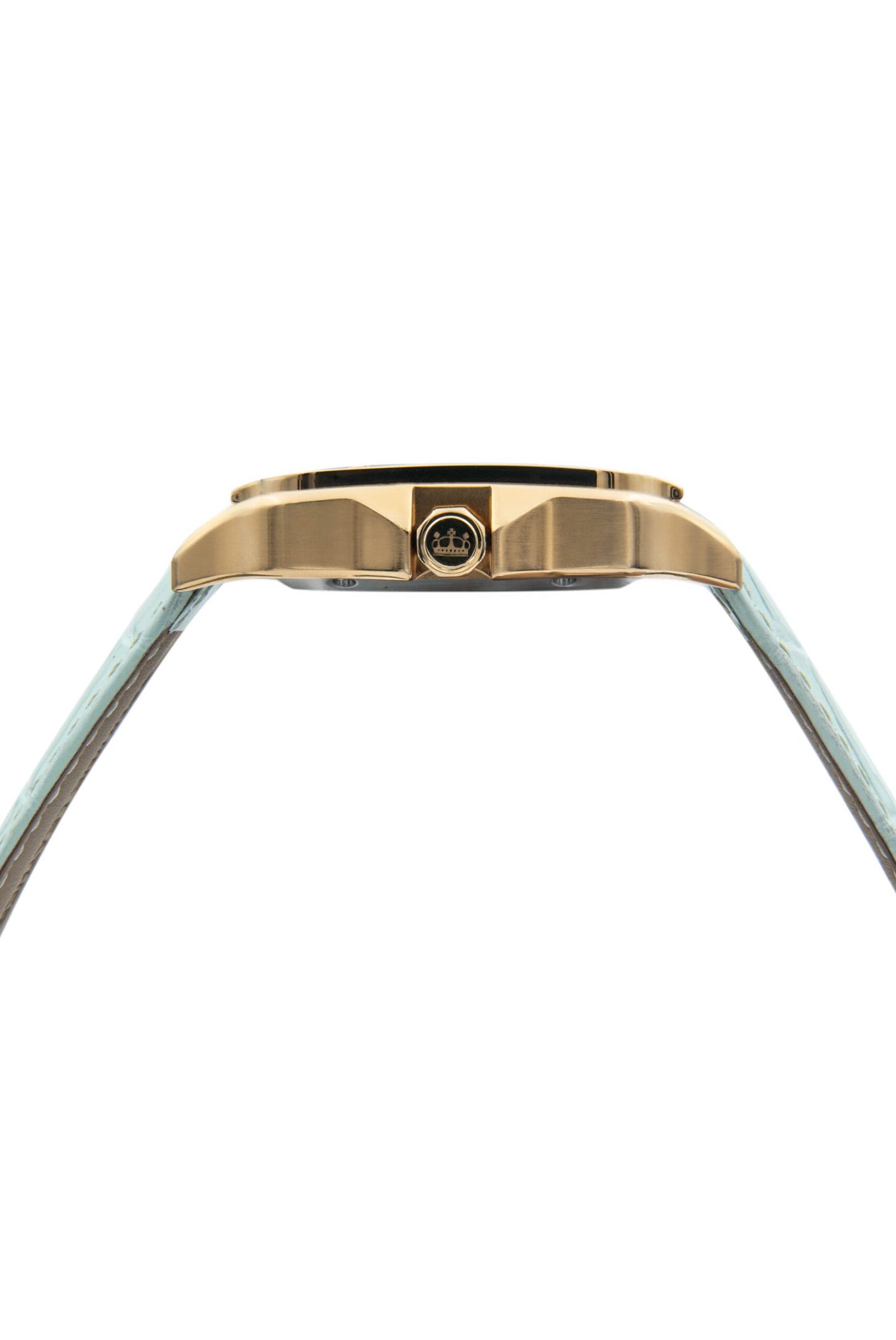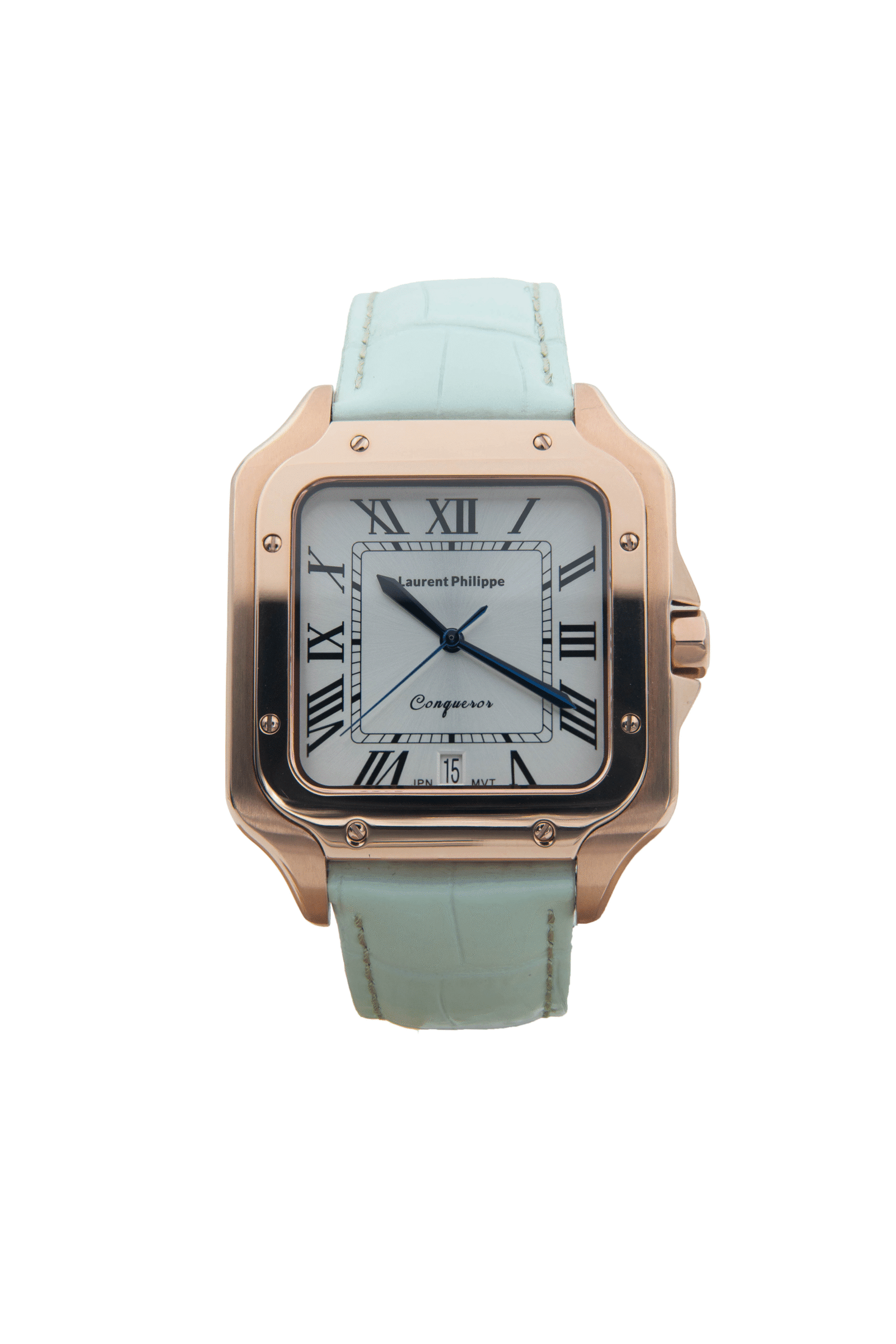 Luxury rose gold watch with a mint green leather strap inspired by the elegance of jade.